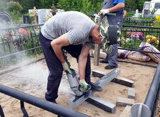 Первым делом мы подготовили участок к работам: демонтировали уже установленное надгробье, а также разровняли почву на могиле, тем самым подготовив её к укладке наземного покрытия.