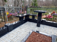 Далее мы приклеиваем лавочки и столешницу, в цветник засыпаем мульчу. Когда все работы на участке завершены – замываем брусчатку, тем самым смывая осевшую на памятнике и оградке бетонную пыль.