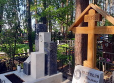 Так выглядело место захоронения на момент окончания работы: деревянный крест покрыт защитным раствором; мраморные изделия отшлифованы и покрыты гидрофобной субстанцией, стыки элементов промазаны белым герметиком; полые столбики, восстановлены; в цветнике заменена земля и посажен газон.
